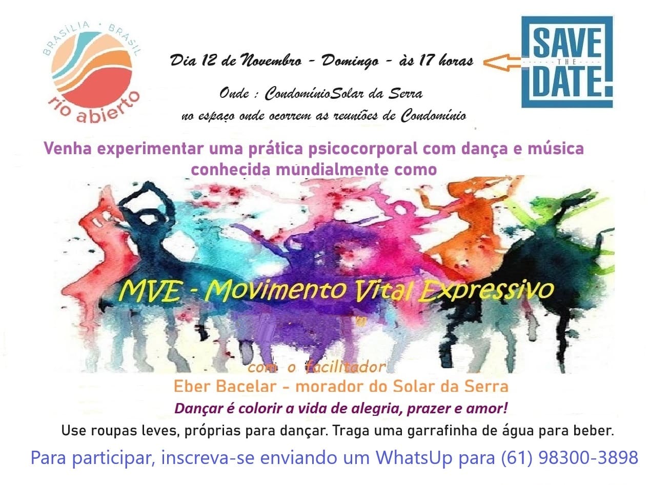 Temos um convite especial para todos(as): neste domingo, 12/11/23 às 17 horas, acontecerá a primeira sessão gratuita de Movimento Vital Expressivo (MVE) no Condomínio Solar da Serra. Para homens e mulheres maiores de 18 anos.