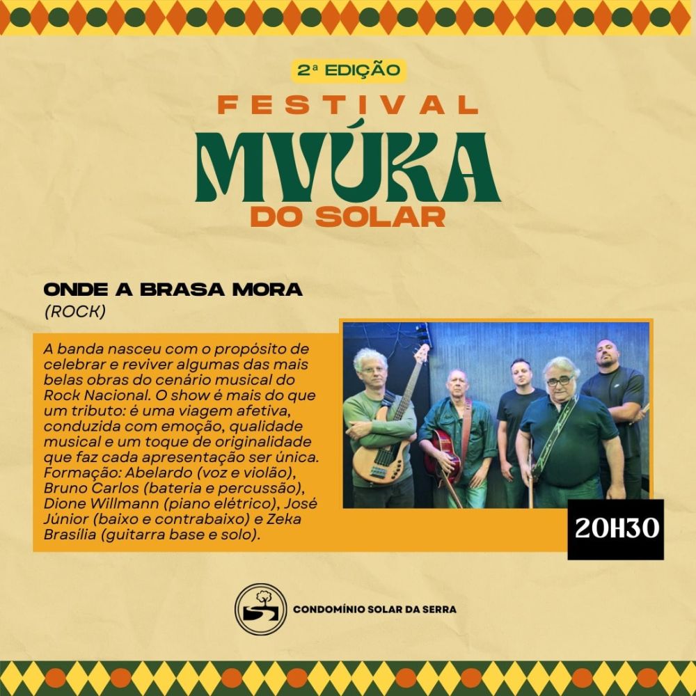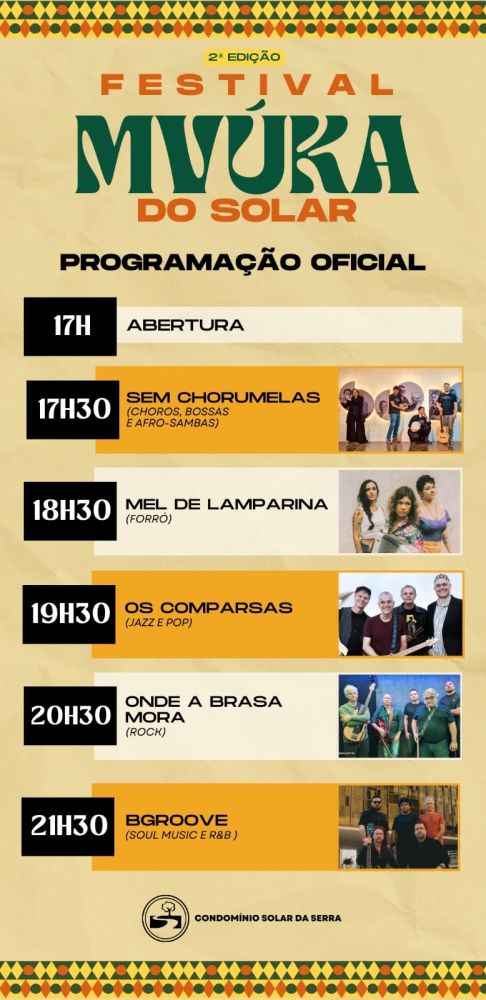 No dia 06 de setembro, sábado, o Clube Solar será palco de uma grande celebração de lazer, cultura e integração entre condôminos, convidados e amigos. Inspirado na palavra Mvúka, de origem banta e língua quicongo — que significa uma aglomeração ruidosa como forma de lazer e celebração — o festival promete uma noite inesquecível.