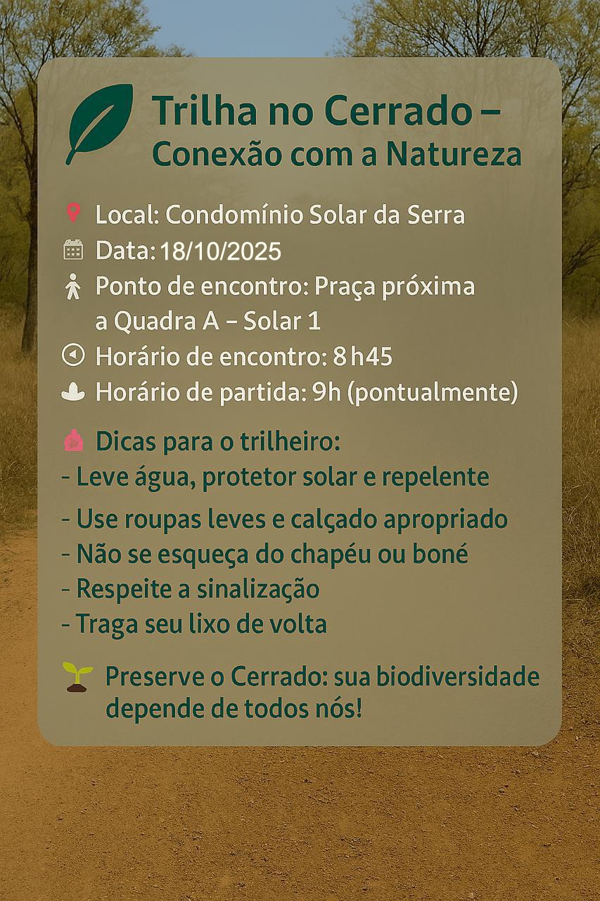 No dia 18/10 (sábado), a convite do grupo de moradores do Solar da Serra, será realizada uma atividade muito especial: Trilha no Cerrado – Conexão com a Natureza.