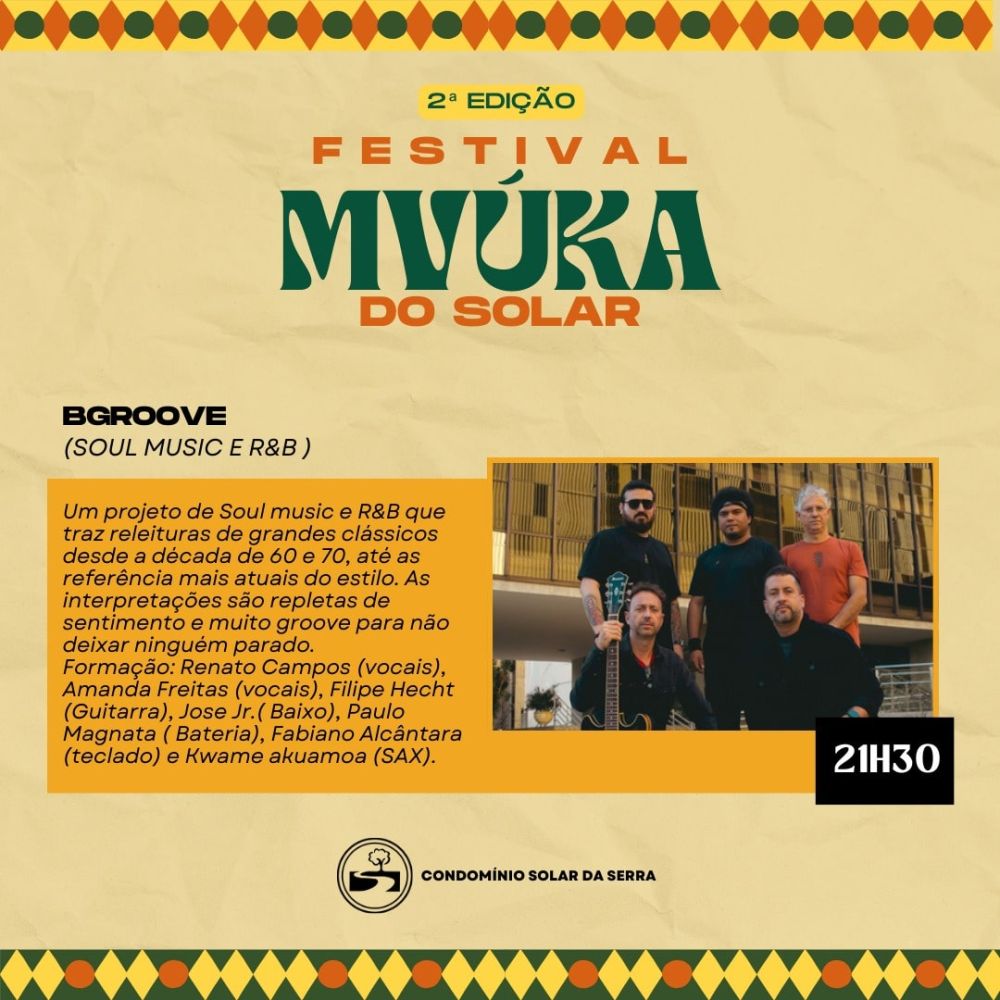 No dia 06 de setembro, sábado, o Clube Solar será palco de uma grande celebração de lazer, cultura e integração entre condôminos, convidados e amigos. Inspirado na palavra Mvúka, de origem banta e língua quicongo — que significa uma aglomeração ruidosa como forma de lazer e celebração — o festival promete uma noite inesquecível.